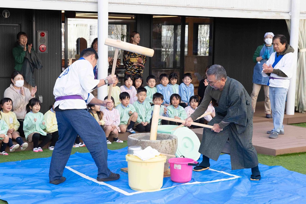 十二支のお面をつけた先生たちを紹介し、お正月の代表的な遊び『福笑い』(巨大な祐介先生福笑いです)と、もちつきを楽しみました。もちつきは餅米からもちになる過程を間近に見ながら、先生たちがつく様子に大盛り上がりで!