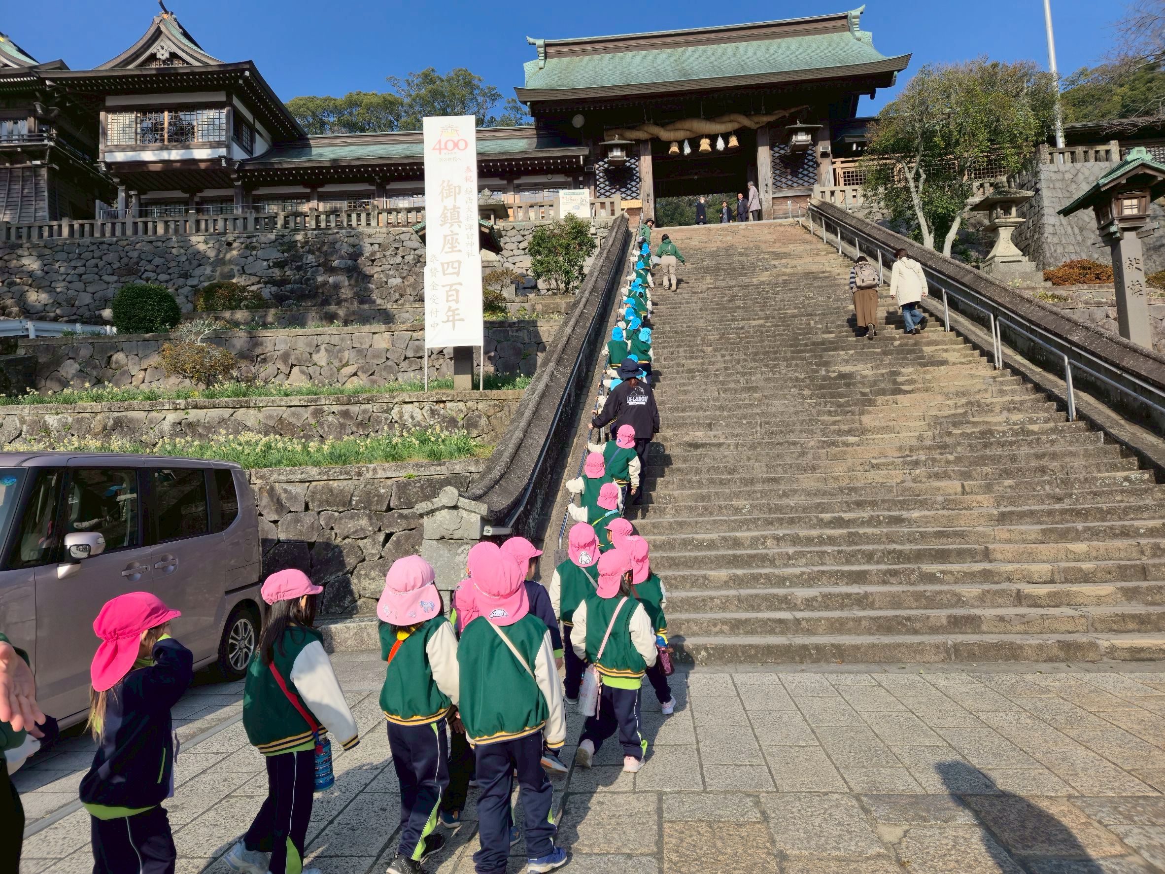 年中組『いのちの学習』として、初詣の文化に触れること、動物園の生き物を見学することを目的とし諏訪神社へ行ってきました。長い階段を小さな足で登りきり、それぞれの感謝や願い事を込めて手を合わせた後、ひろばに移動して動物たちを見てまわりました。日本の文化に親しみを持ちながら、様々な生き物と共存していることを再確認し“いのち”について考えることができ、実りのある時間となりました。今回の活動で、子どもたちが周りの人や環境、“いのち”に対して「ありがとう」の気持ちをもつきっかけになればと思います。