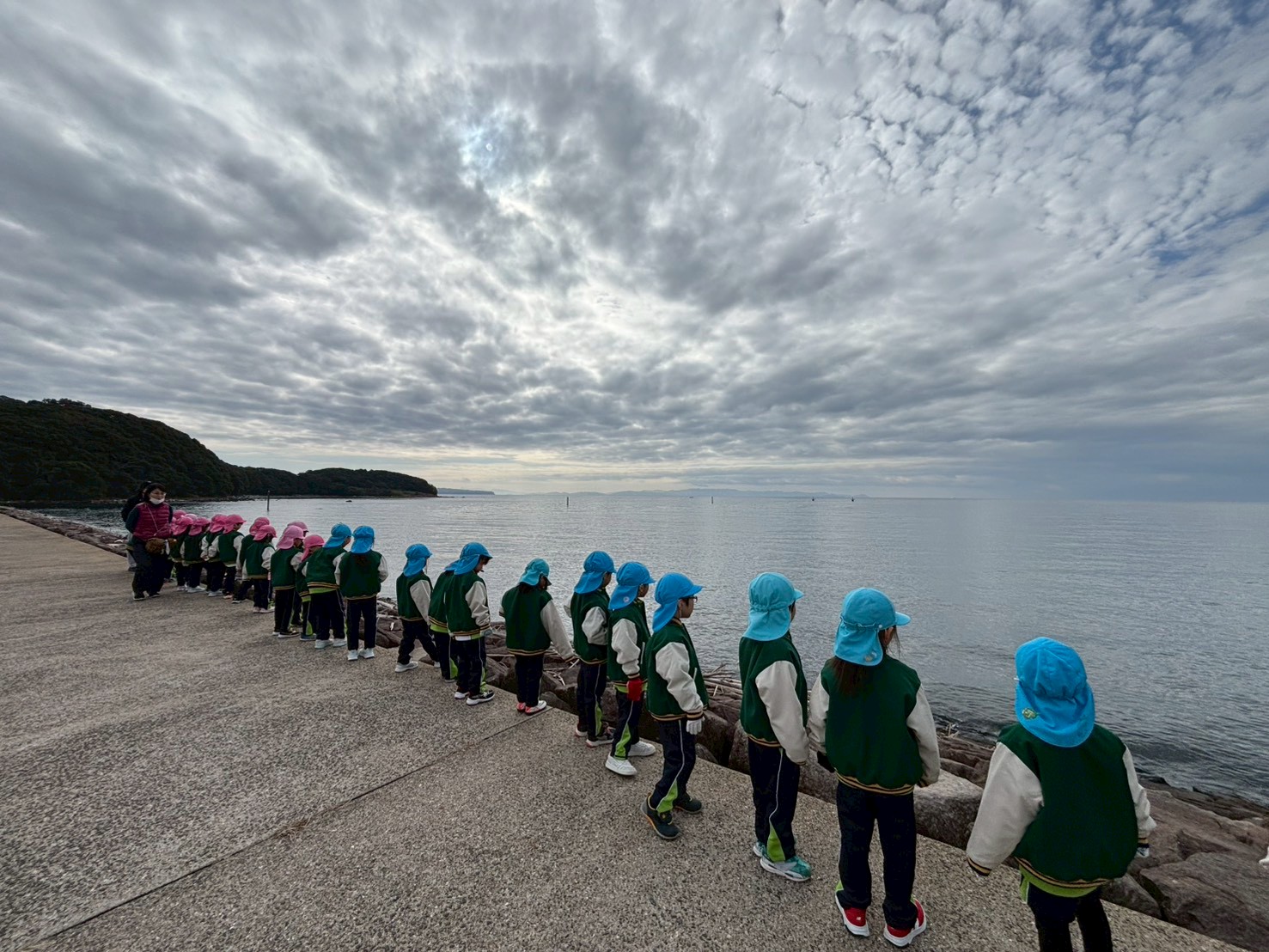 今日は年中組いのちの学習として、これまで慣れ親しんだ結の浜と昨年10月に磯遊びで訪れた江の浦へ再び行き、これまでの海遊びで楽しかった思い出を振り返りながら、海の見学とごみ拾いをしました。今の寒い時期の海の様子を見て、実際に風や波の強さ、砂や海水の冷たさ等を肌で感じてきました。「海の中も寒いのかな?」と生き物の生活にも想像を膨らませ、「生き物さんのためにもゴミ拾おう!」と積極的にゴミを拾う子どもたちの姿には、海の生き物を大切に思う気持ちがいっぱいのようでした。帰りのバスの中では「また海に来たい!」「楽しかった!」「海で遊びたいね!」とたくさんの笑顔が見られました。♪