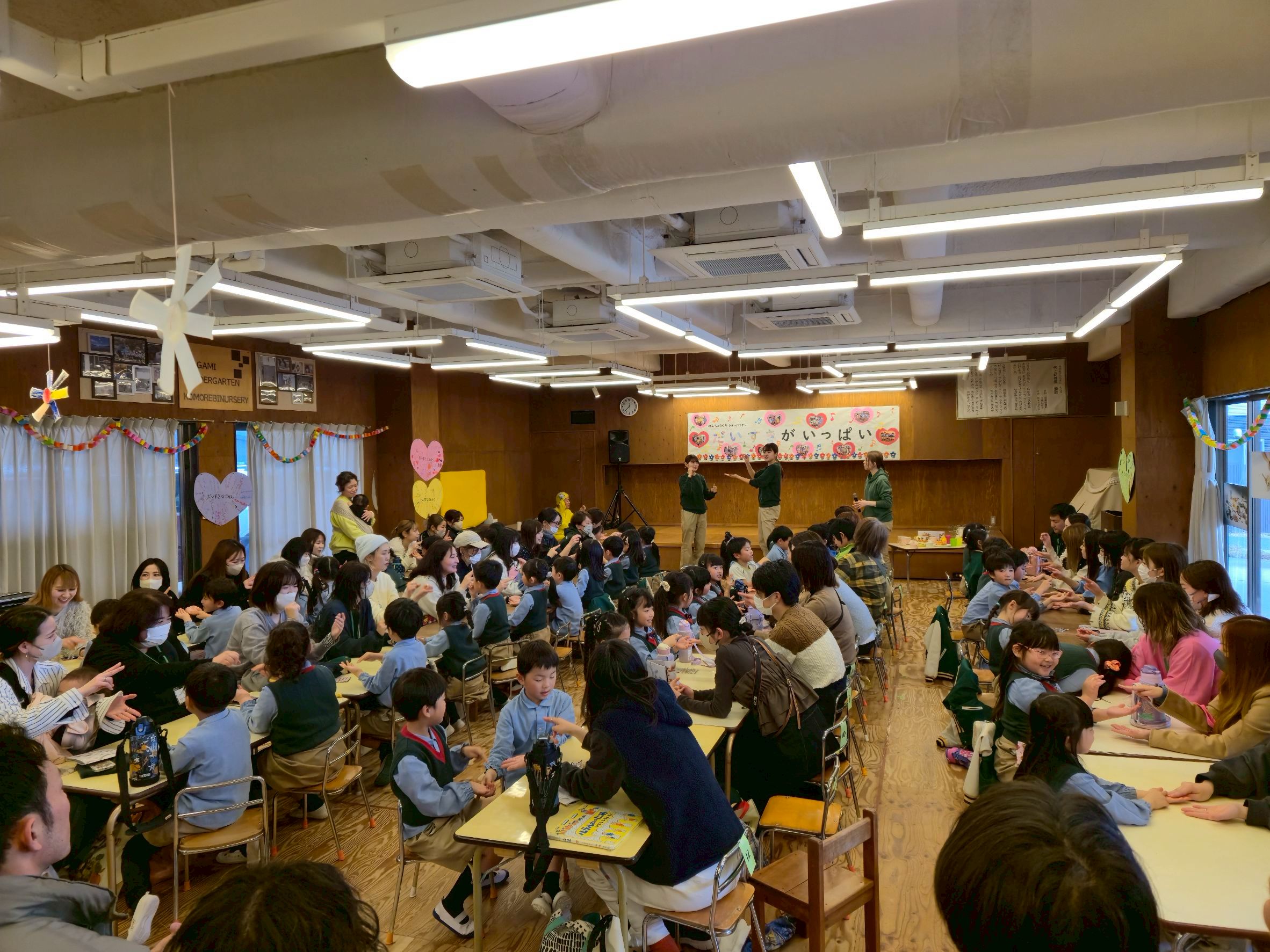 今日は年長組のお別れ会を行いました。おゆうぎ会が終わりクラスの枠を超えてより一層仲が深まった子どもたちと、どんなお別れ会を作っていきたいかを皆で話し合い、“友達や家族、先生に沢山のだいすきを伝えたい♡”という気持ちから「大好きがいっぱいのお別れ会」というテーマに決まりました。ヨーヨーやさん、くじ引きやさん、サッカーやさん、的当て屋さん、キーホルダーやさん、クッキーやさん、ボーリングやさんに分かれて、1人ひとりの得意なことを活かしながら友達と試行錯誤を重ねて準備を進めてきました。上手くいかないことがあった時にはもう1回挑戦してみようと思えたり、互いのお店の準備を楽しみながら手伝ってくれたりする姿が見られ、とても充実した時間を過ごすことができたように感じます。おやつパーティーでは「おいしいね」と笑い合う親子の姿や大好きな先生たちからの出し物に沢山の愛を感じました♪園での生活も残り少なくなってきましたが、子どもたちと一緒に沢山の気持ちを感じ共有しながら寄り添っていきます。